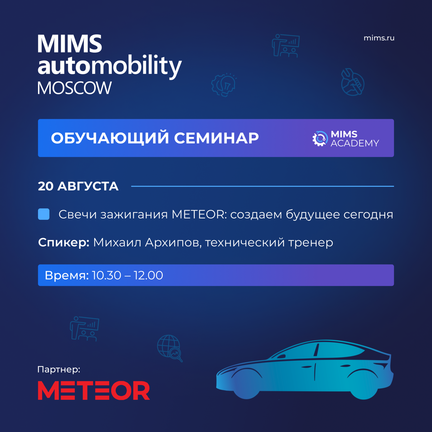 Одним из участников деловой программы является генеральный партнер выставки, премиальный бренд свечей зажигания METEOR. 20 августа на площадке MIMS ACADEMY спикеры компании проведут обучающий семинар «Свечи зажигания METEOR: создаем будущее сегодня».